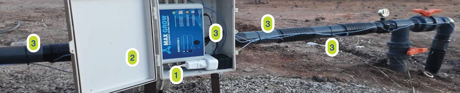 El emisor electrónico emite pulsos de ondas mecánicas que se transfieren alrededor de la tubería de riego. Las diversas señales de frecuencia disuelven a nivel molecular todas las sales metálicas contenidas en el agua que fluye a través de la tubería y así se impide que las sales se acumulen en el suelo y se produzca un efecto de lixiviado en profundidad